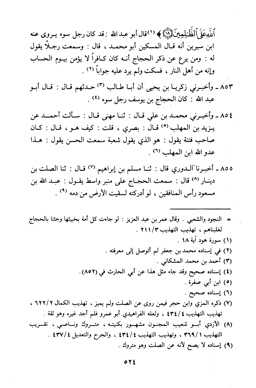 853 - وَأَخْبَرَنِي زَكَرِيَّا بْنُ يَحْيَى، أَنَّ أَبَا طَالِبٍ حَدَّثَهُمْ قَالَ: قَالَ أَبُو عَبْدِ اللَّهِ: «§كَانَ الْحَجَّاجُ بْنُ يُوسُفَ رَجُلَ سُوءٍ»