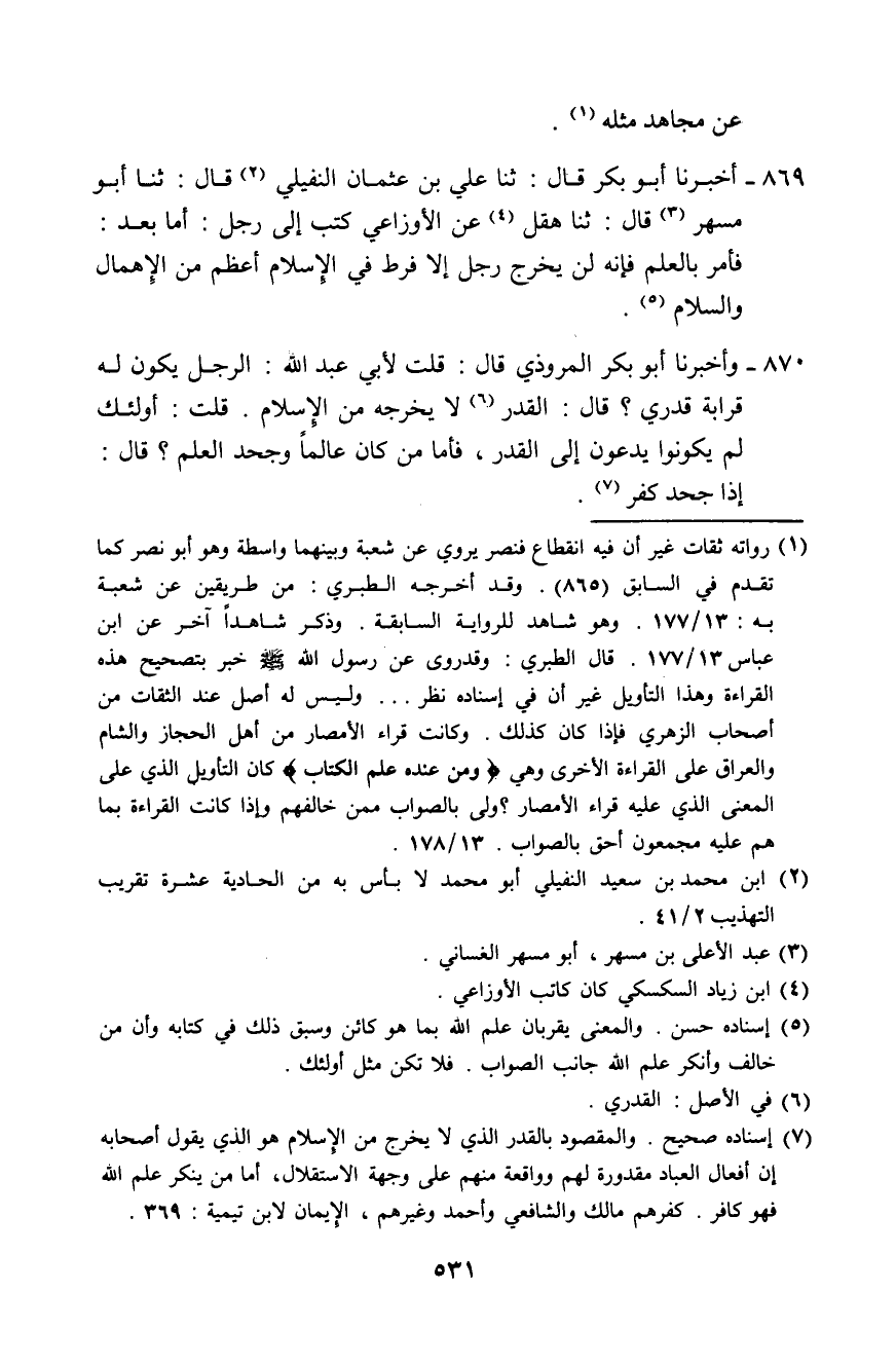 869 - أَخْبَرَنَا أَبُو بَكْرٍ، قَالَ: ثَنَا عَلِيُّ بْنُ عُثْمَانَ النُّفَيْلِيُّ، قَالَ: ثَنَا أَبُو مُسْهِرٍ، قَالَ: ثَنَا هِقْلٌ، عَنِ الْأَوْزَاعِيِّ، كَتَبَ إِلَيَّ رَجُلٌ: أَمَّا بَعْدُ، فَأْمُرْ بِالْعِلْمِ، فَإِنَّهُ §لَنْ يَخْرُجَ رَجُلٌ إِلَّا فَرَّطِ فِي الْإِسْلَامِ أَعْظَمَ مِنَ الْإِهْمَالِ، وَالسَّلَامُ