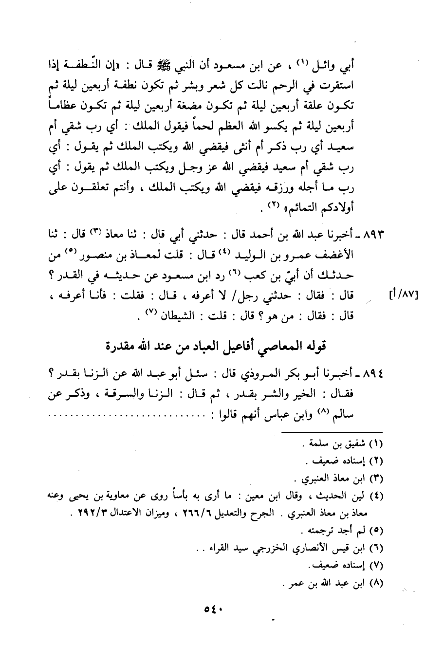 893 - أَخْبَرَنَا عَبْدُ اللَّهِ بْنُ أَحْمَدَ، قَالَ: حَدَّثَنِي أَبِي قَالَ: ثَنَا مُعَاذٌ، قَالَ: ثَنَا الْأَغْضَفُ عَمْرُو بْنُ الْوَلِيدِ قَالَ: قُلْتُ لِمُعَاذِ بْنِ مَنْصُورِ: §مَنْ حَدَّثَكَ أَنَّ «أُبَيَّ بْنَ كَعْبٍ رَدَّ ابْنَ مَسْعُودٍ عَنْ حَدِيثِهِ فِي الْقَدَرِ» ؟ قَالَ: فَقَالَ: حَدَّثَنِي رَجُلٌ لَا أَعْرِفُهُ، قَالَ: فَقُلْتُ: فَأَنَا أَعْرِفُهُ، قَالَ: فَقَالَ: مَنْ هُوَ؟ قُلْتُ: الشَّيْطَانُ