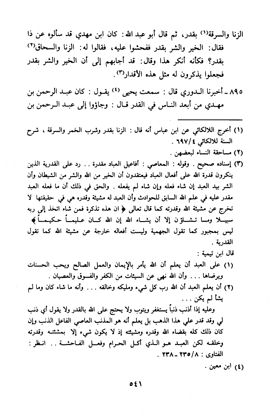 895 - أَخْبَرَنَا الدُّورِيُّ، قَالَ: سَمِعْتُ يَحْيَى يَقُولُ: §كَانَ عَبْدُ الرَّحْمَنِ بْنُ مَهْدِيٍّ مِنْ أَبْعَدِ النَّاسِ فِي الْقَدَرِ، قَالَ: وَجَاءُوا إِلَى عَبْدِ الرَّحْمَنِ بْنِ -[542]- مَهْدِيٍّ، فَقَالَ: قُلِ السِّحَاقُ بِقَدَرٍ؟ يَعْنِي سِحَاقَ النِّسَاءِ، فَقَالَ: لَا أَقُولُ: يُسْتَخَفُّ بِي، وَلَكِنَّهُ قَالَ: كُلُّ شَيْءٍ بِقَدَرٍ