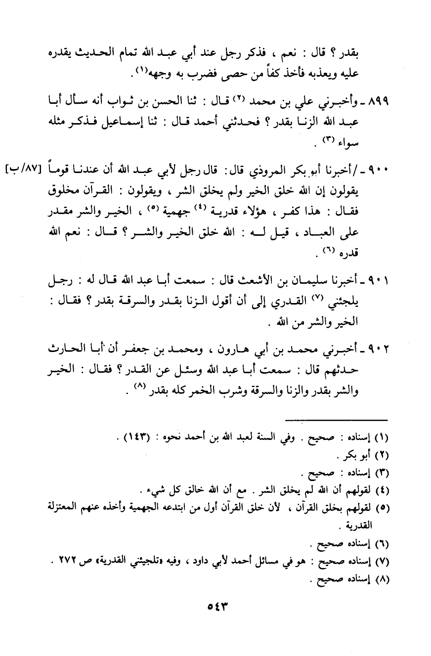 901 - أَخْبَرَنَا سُلَيْمَانُ بْنُ الْأَشْعَثِ، قَالَ: سَمِعْتُ أَبَا عَبْدِ اللَّهِ قَالَ لَهُ رَجُلٌ: يُلْجِئُنِي الْقَدَرِيُّ إِلَى أَنْ أَقُولَ: الزِّنَا بِقَدَرٍ وَالسَّرِقَةُ بِقَدَرٍ؟ فَقَالَ: «§الْخَيْرُ وَالشَّرُّ مِنَ اللَّهِ»