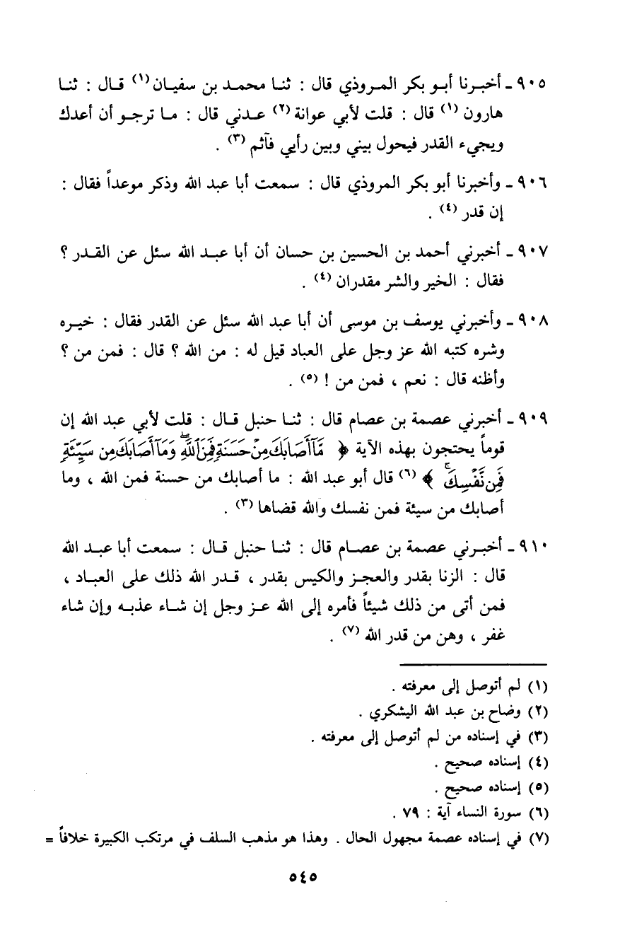 909 - أَخْبَرَنِي عِصْمَةُ بْنُ عِصَامٍ، قَالَ: ثَنَا حَنْبَلٌ، قَالَ: قُلْتُ لِأَبِي عَبْدِ اللَّهِ: إِنَّ قَوْمًا يَحْتَجُّونَ بِهَذِهِ الْآيَةِ {§مَا أَصَابَكَ مِنْ حَسَنَةٍ فَمِنَ اللَّهِ، وَمَا أَصَابَكَ مِنْ سَيِّئَةٍ فَمِنْ نَفْسِكَ} [النساء: 79] ، قَالَ أَبُو عَبْدِ اللَّهِ: «مَا أَصَابَكَ مِنْ حَسَنَةٍ فَمِنَ اللَّهِ، وَمَا أَصَابَكَ مِنْ سَيِّئَةٍ فَمِنْ نَفْسِكَ، وَاللَّهُ قَضَاهَا»