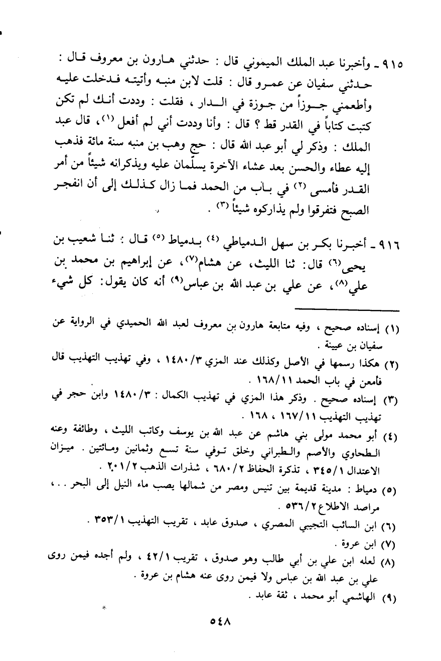 915 - وَأَخْبَرَنَا عَبْدُ الْمَلِكِ الْمَيْمُونِيُّ، قَالَ: حَدَّثَنِي هَارُونُ بْنُ مَعْرُوفٍ، قَالَ: حَدَّثَنِي سُفْيَانُ، عَنْ عَمْرٍو قَالَ: قُلْتُ لِابْنِ مُنَبِّهٍ وَأَتَيْتُهُ فَدَخَلْتُ عَلَيْهِ وَأَطْعَمَنِي جَوْزًا مِنْ جَوْزَةٍ فِي الدَّارِ، فَقُلْتُ: §وَدِدْتُ أَنَّكَ لَمْ تَكُنْ كَتَبْتَ كِتَابًا فِي الْقَدَرِ قَطُّ؟ قَالَ: وَأَنَا وَدِدْتُ أَنِّي لَمْ أَفْعَلْ "