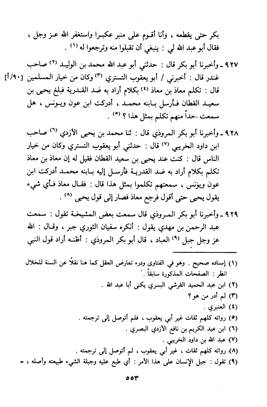 928 - وَأَخْبَرَنَا أَبُو بَكْرٍ الْمَرُّوذِيُّ، قَالَ: ثَنَا مُحَمَّدُ بْنُ يَحْيَى الْأَزْدِيُّ صَاحِبُ ابْنِ دَاوُدَ الْخُرَيْبِيِّ قَالَ: حَدَّثَنِي أَبُو يَعْقُوبَ التُّسْتَرِيُّ وَكَانَ مِنْ خِيَارِ النَّاسِ، قَالَ: كُنْتُ عِنْدَ يَحْيَى بْنِ سَعِيدٍ الْقَطَّانِ، فَقِيلَ لَهُ: إِنَّ مُعَاذَ بْنَ مُعَاذٍ تَكَلَّمَ بِكَلَامٍ أَرَادَ بِهِ ضِدَّ الْقَدَرِيَّةِ، فَأَرْسَلَ إِلَيْهِ بِابْنِهِ مُحَمَّدٍ: §أَدْرَكْتَ ابْنَ عَوْنٍ وَيُونُسَ، سَمِعْتُهُمْ تَكَلَّمُوا بِمِثْلِ هَذَا؟ قَالَ: فَقَالَ مُعَاذٌ: فَأَيُّ شَيْءٍ يَقُولُ يَحْيَى حَتَّى أَقُولَ، فَرَجَعَ مُعَاذٌ، فَصَارَ إِلَى قَوْلِ يَحْيَى