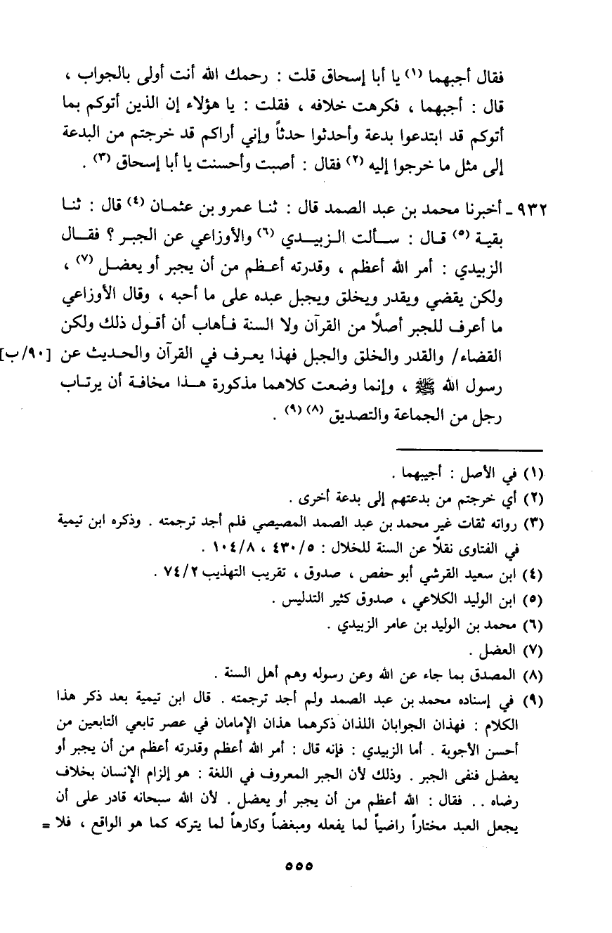 932 - أَخْبَرَنَا مُحَمَّدُ بْنُ عَبْدِ الصَّمَدِ، قَالَ: ثَنَا عَمْرُو بنُ عُثْمَانَ، قَالَ: ثَنَا بَقِيَّةُ، قَالَ: سَأَلْتُ الزُّبَيْدِيَّ وَالْأَوْزَاعِيَّ عَنِ الْجَبْرِ؟، فَقَالَ الزُّبَيْدِيُّ: §أَمْرُ اللَّهِ أَعْظَمُ، وَقُدْرَتُهُ أَعْظَمُ مِنْ أَنْ يُجْبِرَ أَوْ يَعْضِلَ، وَلَكِنْ يَقْضِي وَيُقَدِّرُ وَيَخْلُقُ وَيَجْبِلُ عَبْدَهُ عَلَى مَا أَحَبَّهُ. وَقَالَ الْأَوْزَاعِيُّ: مَا أَعْرِفُ لِلْجَبْرِ أَصْلًا مِنَ الْقُرْآنِ وَلَا السُّنَّةِ، فَأَهَابُ أَنْ أَقُولَ ذَلِكَ، وَلَكِنِ الْقَضَاءَ وَالْقَدَرِ وَالْخَلْقَ وَالْجَبْلَ، فَهَذَا يُعْرَفُ فِي الْقُرْآنِ وَالْحَدِيثِ عَنْ رَسُولِ اللَّهِ صَلَّى اللهُ عَلَيْهِ وَسَلَّمَ، وَإِنَّمَا وُضِعَتْ كِلَاهُمَا مَذْكُورَةً هَذَا مَخَافَةَ أَنْ يَرْتَابَ رَجُلُ مِنَ الْجَمَاعَةِ وَالتَّصْدِيقِ