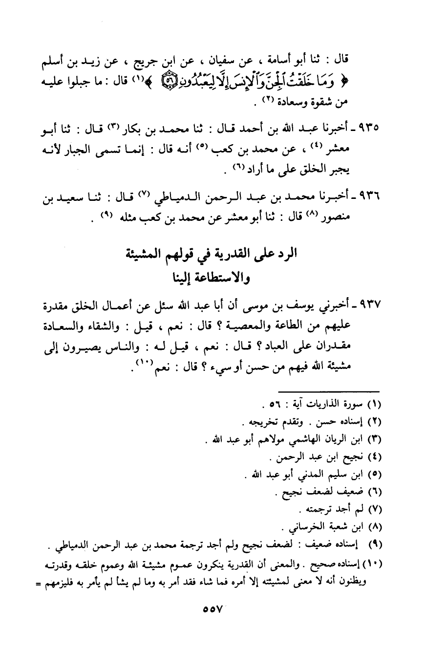 937 - أَخْبَرَنِي يُوسُفُ بْنُ مُوسَى، أَنَّ أَبَا عَبْدَ اللَّهِ سُئِلَ عَنْ أَعْمَالِ الْخَلْقِ، مُقَدَّرَةٌ عَلَيْهِمْ مِنَ الطَّاعَةِ وَالْمَعْصِيَةِ؟ قَالَ: نَعَمْ، قِيلَ: §وَالشَّقَاءُ وَالسَّعَادَةُ مُقَدَّرَانِ عَلَى الْعِبَادِ؟ قَالَ: نَعَمْ، قِيلَ لَهُ: وَالنَّاسُ يَصِيرُونَ إِلَى مَشِيئَةِ اللَّهِ فِيهِمْ مِنْ حَسَنٍ أَوْ سَيِّئٍ؟ قَالَ: نَعَمْ