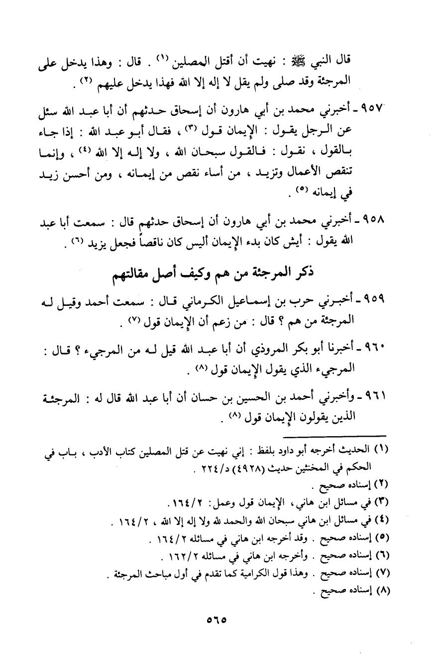 959 - أَخْبَرَنِي حَرْبُ بْنُ إِسْمَاعِيلَ الْكَرْمَانِيُّ، قَالَ: سَمِعْتُ أَحْمَدَ وَقِيلَ لَهُ: الْمُرْجِئَةُ مَنْ هُمْ؟ قَالَ: «§مَنْ زَعَمَ أَنَّ الْإِيمَانَ قَوْلٌ»