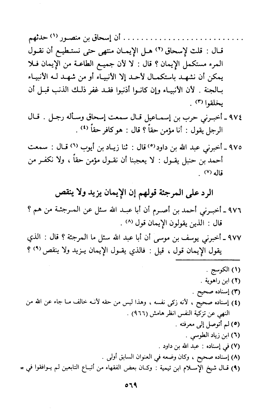 974 - أَخْبَرَنِي حَرْبُ بْنُ إِسْمَاعِيلَ، قَالَ: سَمِعْتُ إِسْحَاقَ وَسَأَلَهُ رَجُلٌ، قَالَ: §الرَّجُلُ يَقُولُ: أَنَا مُؤْمِنٌ حَقًّا؟ قَالَ: «هُوَ كَافِرٌ حَقًّا»