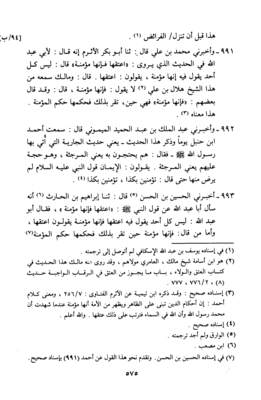 993 - أَخْبَرَنِي الْحُسَيْنُ بْنُ الْحَسَنِ، قَالَ: ثَنَا إِبْرَاهِيمُ بْنُ الْحَارِثِ أَنَّهُ سَأَلَ أَبَا عَبْدِ اللَّهِ عَنْ قَوْلِ النَّبِيِّ صَلَّى اللهُ عَلَيْهِ وَسَلَّمَ: «§أَعْتِقْهَا؛ فَإِنَّهَا مُؤْمِنَةٌ» ، فَقَالَ أَبُو عَبْدِ اللَّهِ: " لَيْسَ كُلُّ أَحَدٍ يَقُولُ فِيهِ: أَعْتِقْهَا فَإِنَّهَا مُؤْمِنَةٌ، يَقُولُونَ: أَعْتِقْهَا، وَأَمَّا مَنْ قَالَ: فَإِنَّهَا مُؤْمِنَةٌ، حِينَ تُقِرُّ بِذَلِكَ فَحُكْمُهَا حُكْمُ الْمُؤْمِنَةِ "