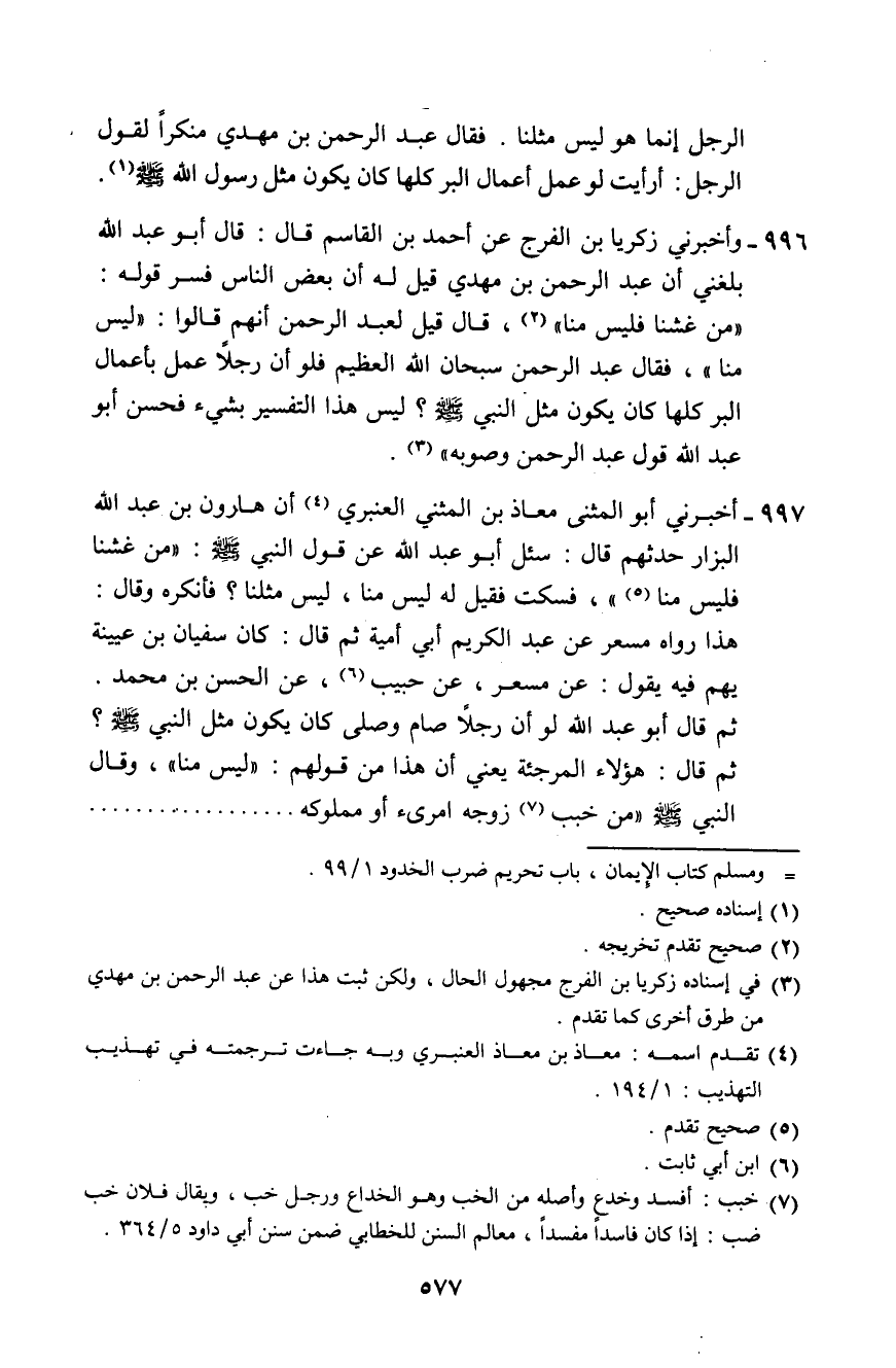 996 - وَأَخْبَرَنِي زَكَرِيَّا بْنُ الْفَرَجِ، عَنْ أَحْمَدَ بْنِ الْقَاسِمِ، قَالَ: قَالَ أَبُو عَبْدِ اللَّهِ: بَلَغَنِي أَنَّ عَبْدَ الرَّحْمَنِ بْنَ مَهْدِيٍّ، قِيلَ لَهُ: إِنَّ بَعْضَ النَّاسِ فَسَّرَ قَوْلَهُ صَلَّى اللهُ عَلَيْهِ وَسَلَّمَ: مَنْ غَشَّنَا فَلَيْسَ مِنَّا، قَالَ: قِيلَ لِعَبْدِ الرَّحْمَنِ: أَنَّهُمْ قَالُوا: لَيْسَ مِثْلَنَا. فَقَالَ عَبْدُ الرَّحْمَنِ: «سُبْحَانَ اللَّهِ الْعَظِيمِ، §فَلَوْ أَنَّ رَجُلًا عَمِلَ بِأَعْمَالِ الْبِرِّ كُلِّهَا، كَانَ يَكُونُ مِثْلَ النَّبِيِّ صَلَّى اللهُ عَلَيْهِ وَسَلَّمَ؟ لَيْسَ هَذَا التَّفْسِيرُ بِشَيْءٍ» ، فَحَسَّنَ أَبُو عَبْدِ اللَّهِ قَوْلَ عَبْدِ الرَّحْمَنِ وَصَوَّبَهُ