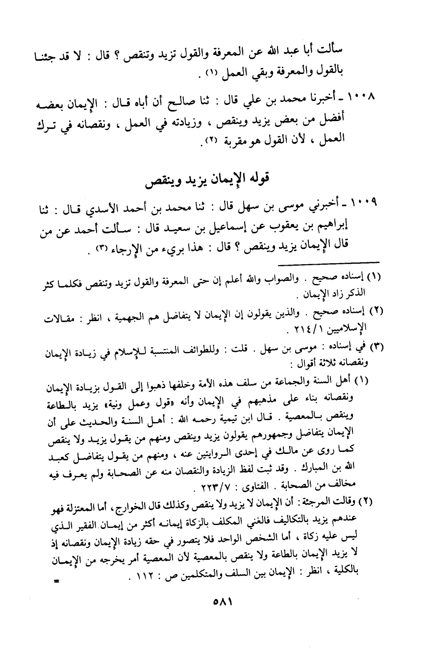 1009 - أَخْبَرَنِي مُوسَى بْنُ سَهْلٍ، قَالَ: ثَنَا مُحَمَّدُ بْنُ أَحْمَدَ الْأَسَدِيُّ، قَالَ: ثَنَا إِبْرَاهِيمُ بْنُ يَعْقُوبَ، عَنْ إِسْمَاعِيلَ بْنِ سَعِيدٍ، قَالَ: سَأَلْتُ أَحْمَدَ عَنْ مَنْ قَالَ: الْإِيمَانُ يَزِيدُ وَيَنْقُصُ؟ قَالَ: «§هَذَا بَرِيءٌ مِنَ الْإِرْجَاءِ»