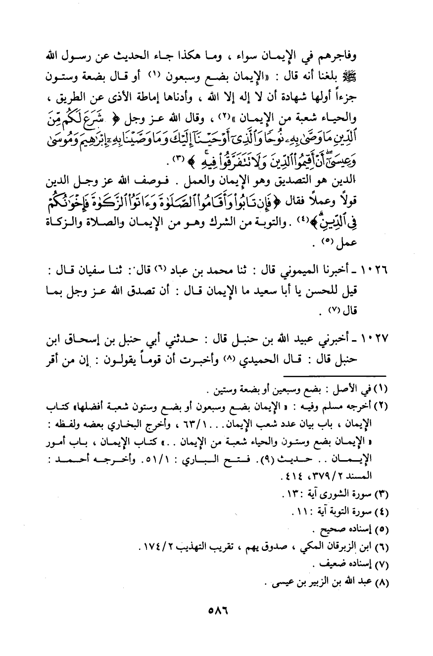 1026 - أَخْبَرَنَا الْمَيْمُونِيُّ، قَالَ: ثَنَا مُحَمَّدُ بْنُ عَبَّادٍ، قَالَ: ثَنَا سُفْيَانُ، قَالَ: قِيلَ لِلْحَسَنِ: يَا أَبَا سَعِيدٍ، §مَا الْإِيمَانُ؟ قَالَ: «أَنْ تُصَدِّقَ اللَّهَ عَزَّ وَجَلَّ بِمَا قَالَ»