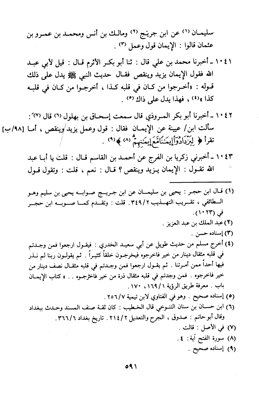1042 - أَخْبَرَنَا أَبُو بَكْرٍ الْمَرُّوذِيُّ، قَالَ: سَمِعْتُ إِسْحَاقَ بْنَ بُهْلُولٍ، قَالَ: سَأَلْتُ ابْنَ عُيَيْنَةَ عَنِ الْإِيمَانِ، فَقَالَ: " §قَوْلٌ وَعَمَلٌ، يَزِيدُ وَيَنْقُصُ، أَمَا تَقْرَأُ: {لِيَزْدَادُوا إِيمَانًا مَعَ إِيمَانِهِمْ} [الفتح: 4] "