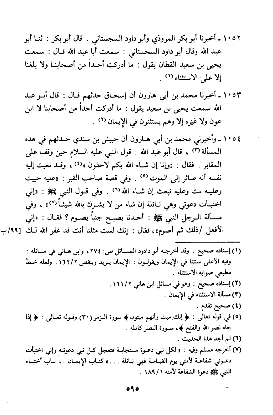 1052 - أَخْبَرَنَا أَبُو بَكْرٍ الْمَرُّوذِيُّ، وَأَبُو دَاوُدَ السِّجِسْتَانِيُّ قَالَ أَبُو بَكْرٍ: ثَنَا أَبُو عَبْدِ اللَّهِ، وَقَالَ أَبُو دَاوُدَ السِّجِسْتَانِيُّ،: سَمِعْتُ أَبَا عَبْدِ اللَّهِ، قَالَ: سَمِعْتُ يَحْيَى بْنَ سَعِيدٍ الْقَطَّانَ، يَقُولُ: «§مَا أَدْرَكْتُ أَحَدًا مِنْ أَصْحَابِنَا، وَلَا بَلَغَنَا إِلَّا عَلَى الِاسْتِثْنَاءِ»