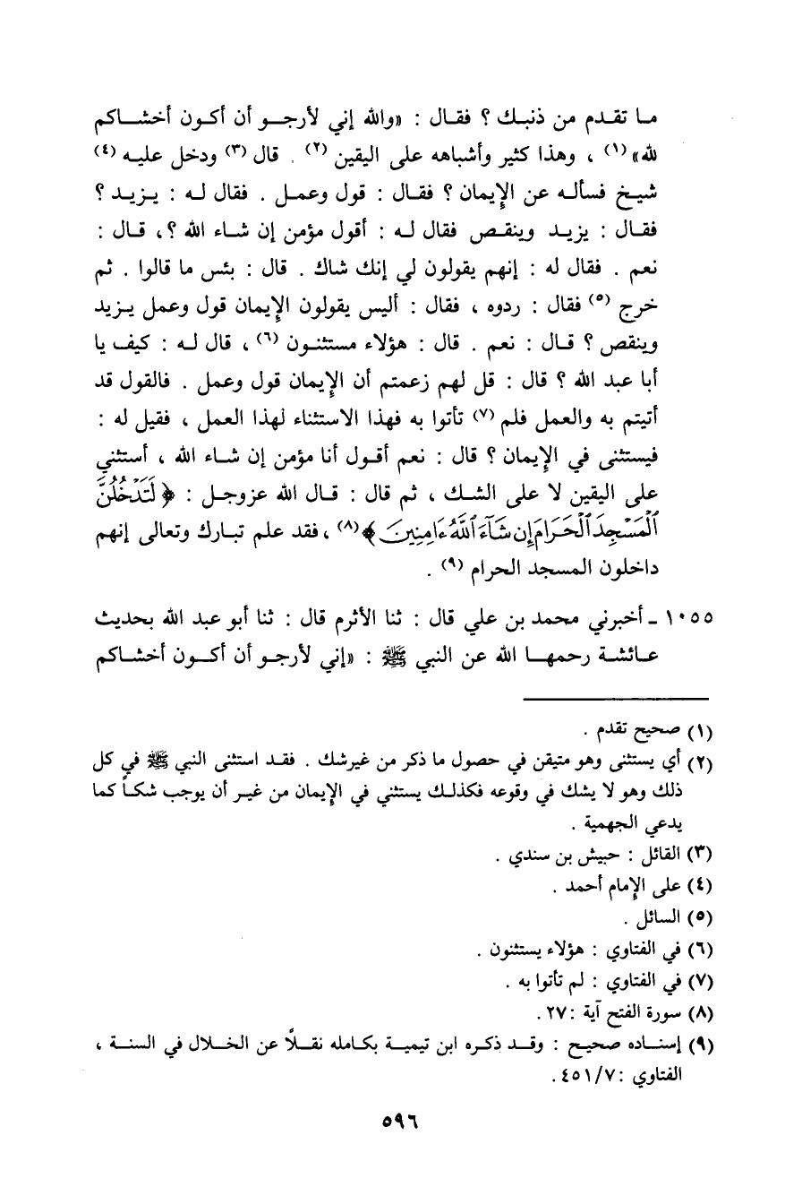 1055 - أَخْبَرَنِي مُحَمَّدُ بْنُ عَلِيٍّ، قَالَ: ثَنَا الْأَثْرَمُ، قَالَ: ثَنَا أَبُو عَبْدِ اللَّهِ بِحَدِيثِ عَائِشَةَ رَحِمَهَا اللَّهُ، عَنِ النَّبِيِّ صَلَّى اللهُ عَلَيْهِ وَسَلَّمَ: «§إِنِّي لَأَرْجُو أَنْ أَكُونَ أَخْشَاكُمْ -[597]- لِلَّهِ» ، فَقَالَ: «هَذَا أَيْضًا أَرْجُو» ، أَيْ: هُوَ حُجَّةٌ فِي الِاسْتِثْنَاءِ فِي الْإِيمَانِ، أَيْ إِنَّهُ قَدْ قَالَ: أَرْجُو، وَهُوَ أَخْشَاهُمْ