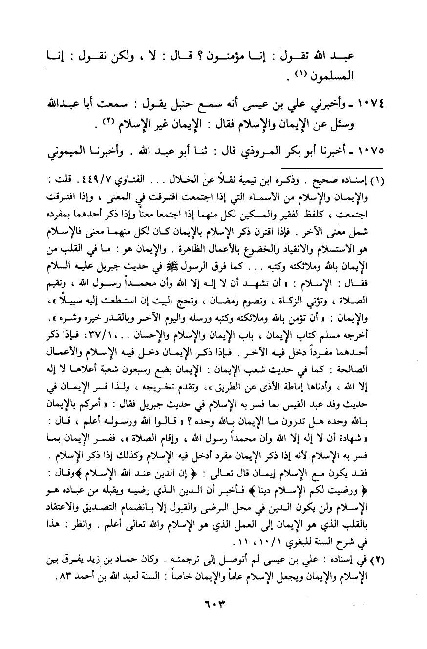 1074 - وَأَخْبَرَنِي عَلِيُّ بْنُ عِيسَى، أَنَّهُ سَمِعَ حَنْبَلًا، يَقُولُ: سَمِعْتُ أَبَا عَبْدِ اللَّهِ، وَسُئِلَ عَنِ الْإِيمَانِ وَالْإِسْلَامِ، فَقَالَ: «§الْإِيمَانُ غَيْرُ الْإِسْلَامِ»