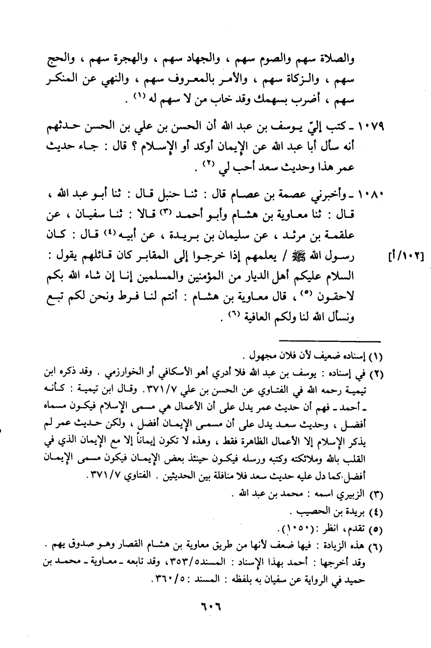 1079 - كَتَبَ إِلَيَّ يُوسُفُ بْنُ عَبْدِ اللَّهِ، أَنَّ الْحَسَنَ بْنَ عَلِيِّ بْنِ الْحَسَنِ حَدَّثَهُمْ أَنَّهُ سَأَلَ أَبَا عَبْدِ اللَّهِ عَنِ §الْإِيمَانِ أَوْكَدُ أَوِ الْإِسْلَامُ؟ قَالَ: «جَاءَ حَدِيثُ عُمَرَ هَذَا وَحَدِيثُ سَعْدٍ أَحَبُّ لِي»