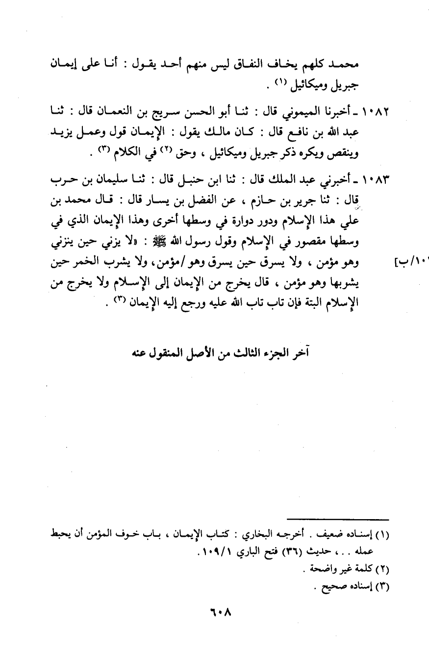 1083 - أَخْبَرَنِي عَبْدُ الْمَلِكِ، قَالَ: ثَنَا ابْنُ حَنْبَلٍ، قَالَ: ثَنَا سُلَيْمَانُ بْنُ حَرْبٍ، قَالَ: ثَنَا جَرِيرُ بْنُ حَازِمٍ، عَنِ الْفَضْلِ بْنِ يَسَارٍ، قَالَ: قَالَ مُحَمَّدُ بْنُ عَلِيٍّ: «هَذَا الْإِسْلَامُ، وَدَوَّرَ دَوَّارَةً فِي وَسَطِهَا أُخْرَى، وَهَذَا الْإِيمَانُ الَّذِي فِي وَسَطِهَا مَقْصُورٌ فِي الْإِسْلَامِ» ، وَقَوْلُ رَسُولِ اللَّهِ صَلَّى اللهُ عَلَيْهِ وَسَلَّمَ: لَا يَزْنِي حِينَ يَزْنِي وَهُوَ مُؤْمِنٌ، وَلَا يَسْرِقُ حِينَ يَسْرِقُ وَهُوَ مُؤْمِنٌ، وَلَا يَشْرَبُ الْخَمْرَ حِينَ يَشْرَبُهَا وَهُوَ مُؤْمِنٌ، قَالَ: §يَخْرُجُ مِنَ الْإِيمَانِ إِلَى الْإِسْلَامِ، وَلَا يَخْرُجُ مِنَ الْإِسْلَامِ الْبَتَّةَ، فَإِنْ تَابَ تَابَ اللَّهُ عَلَيْهِ، وَرَجَعَ إِلَيْهِ الْإِيمَانُ "