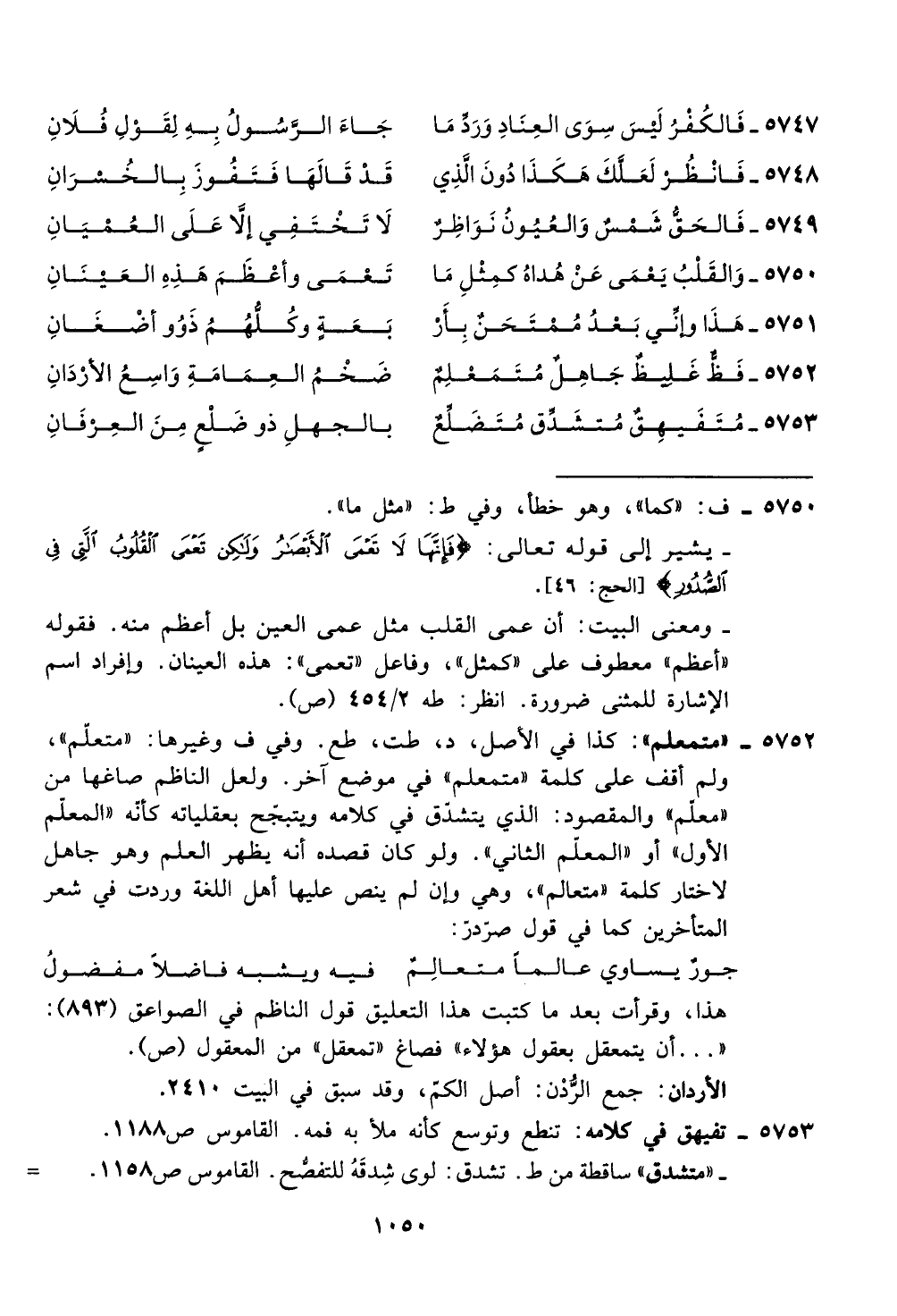 - ومعنى البيت: أن عمى القلب مثل عمى العين بل أعظم منه. فقوله