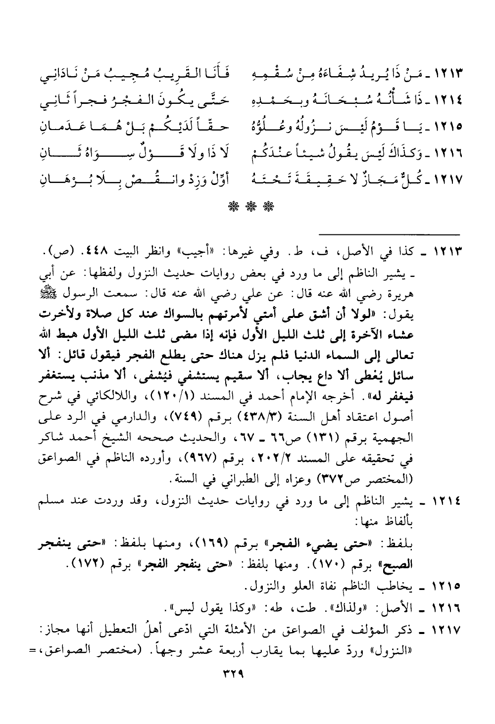 يشير الناظم إلى ما ورد في روايات حديث النزول، وقد وردت عند مسلم