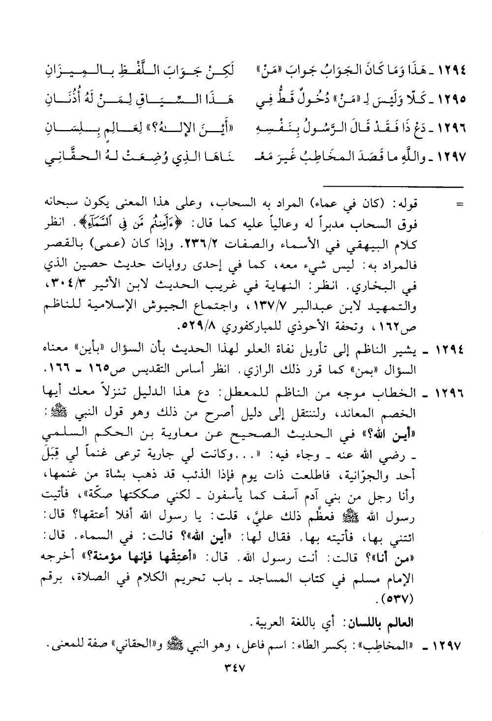 يشير الناظم إلى تأويل نفاة العلو لهذا الحديث بأن السؤال "بأين" معناه