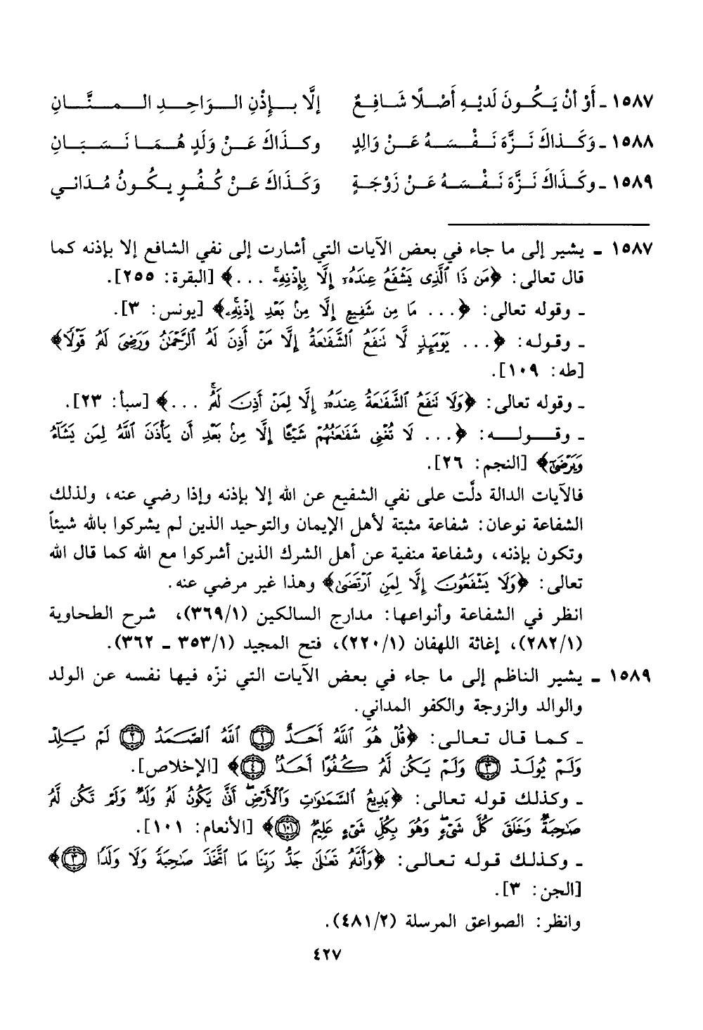 يشير الناظم إلى ما جاء في بعض الآيات التي نره فيها نفسه عن الولد