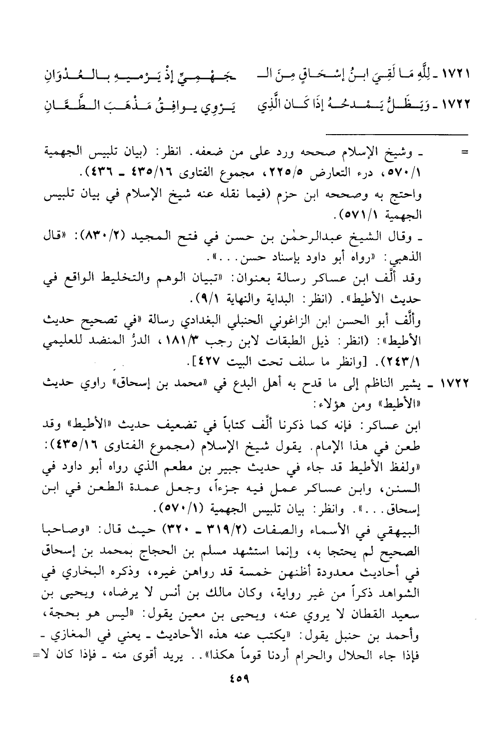 1722 - يشير الناظم إلى ما قدح به اهل البدع في "محمد بن إسحاق " راوي حديث