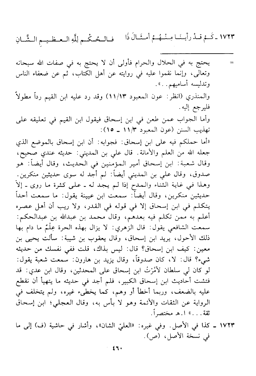 "اما حملكم فحه على ابن إسحاق: فجوابه: ان ابن إسحاق بالموضع الذي