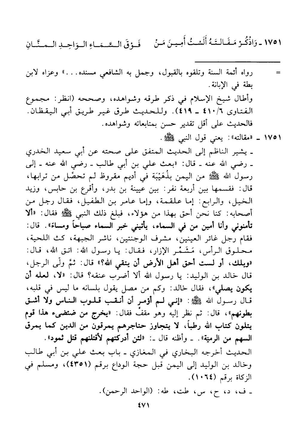 - يشير الناظم إلى الحديث المتفق على صحته عن أبي سعيد الخدري