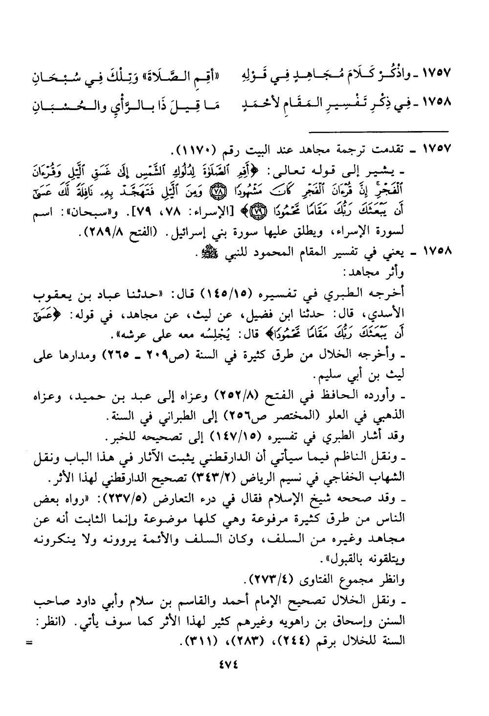 - و خرجه الخلال من طرق كئيرة في السنة (ص 209 - 265) ومدارها على