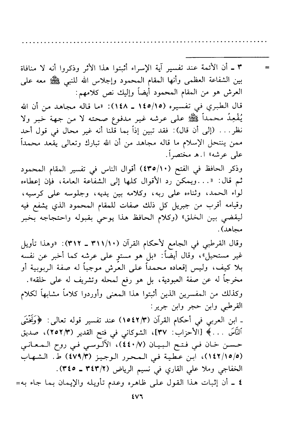 وذكر الحافظ في الفتح (435/ 10) أقوال الناس في تفسير المقام المحمود
