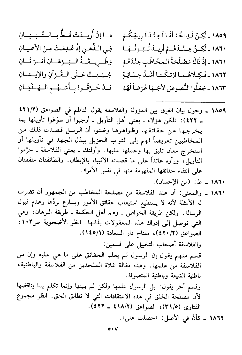 1859 - وحول بيان الفرق بين المؤولة والفلاسفة يقول الناظم في الصواعق (42112