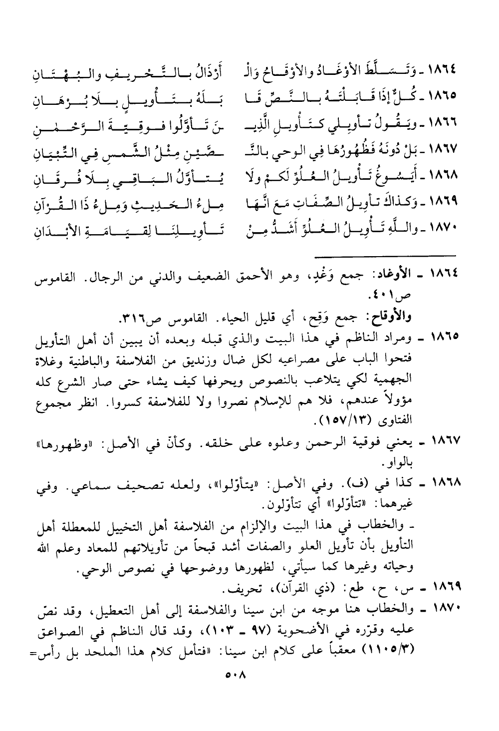 - والخطاب في هذا البيت والإلزام من الفلاسفة هل التخييل للمعطلة أهل
