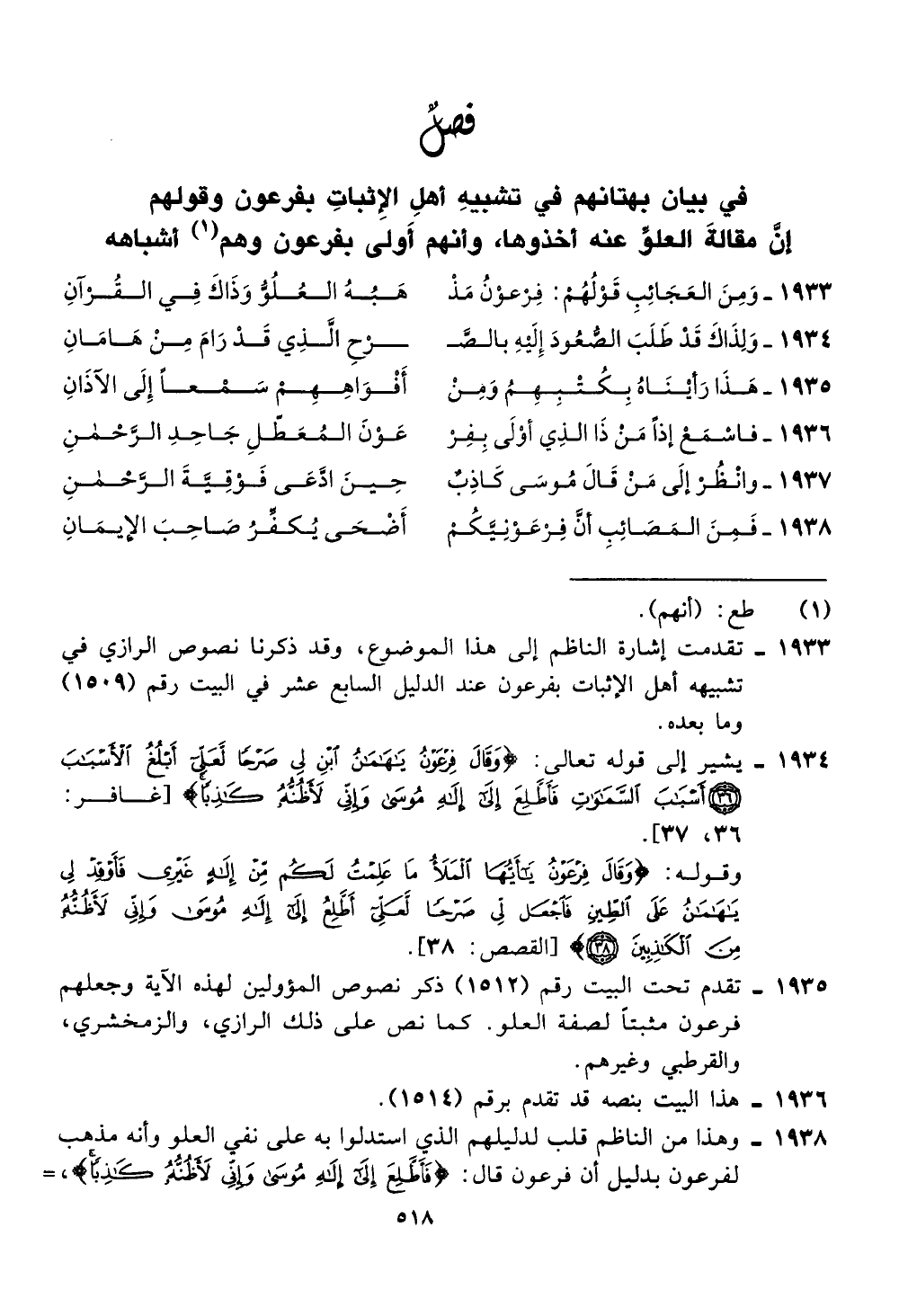 تشبيهه اهل الاثبات بفرعون عند الدليل السابع عشر في البيت رقم (1509)