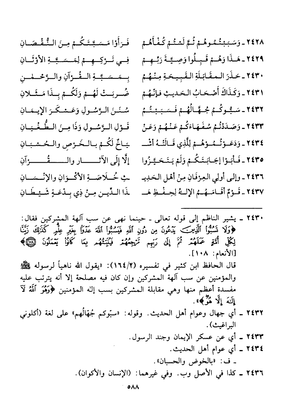 - يشير الناظم إلى قوله تعالى - حينما نهى عن سب الهة السثمركين فقال:
