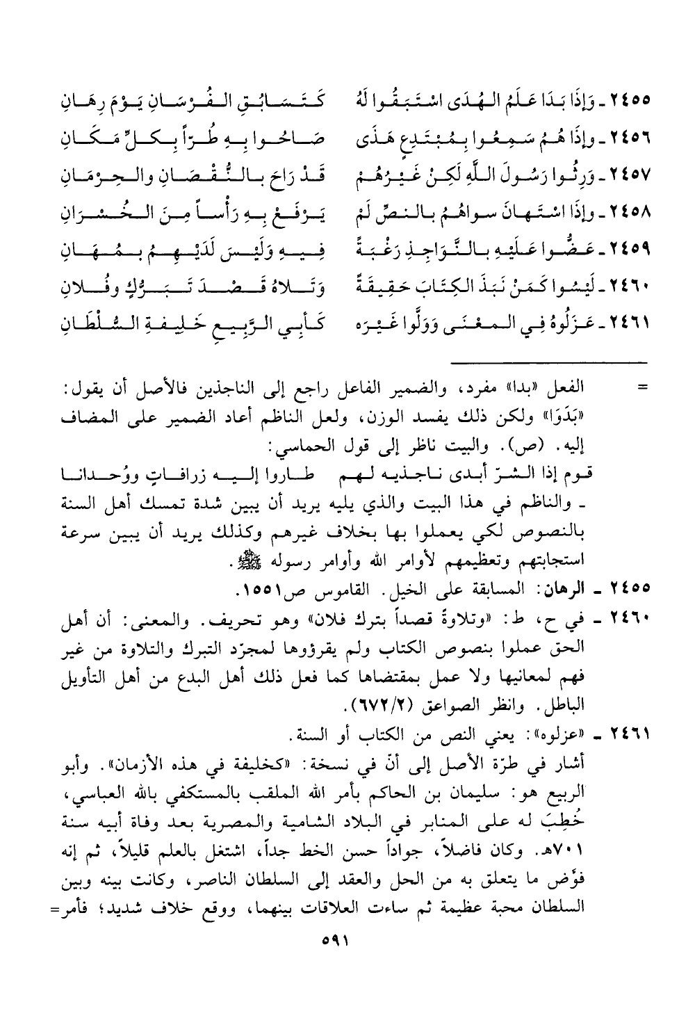 "بدوا) " ولكن ذلك يقسد الوزن، ولعل الناظم اعاد الضمير على المضاف