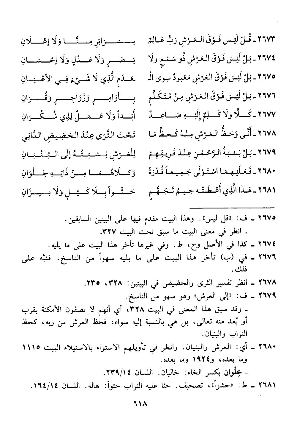 اي: العرثن والبنيان. وانظر في تأويلهم الاستواء بالاستيلاء البيت 1115