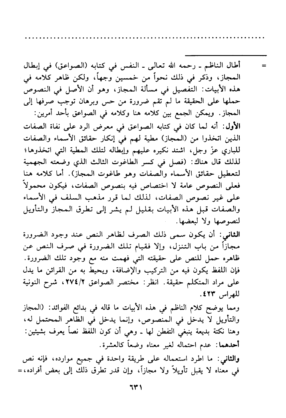 أطال الناظم - رحمه الله تعالى - النفس في كتابه (الصواعق) في إبطال