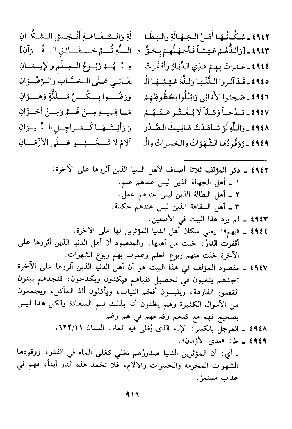 4942 - ذكر المولف ثلاثة أصناف لاهل الدنيا الذين اثروها على الاخرة: