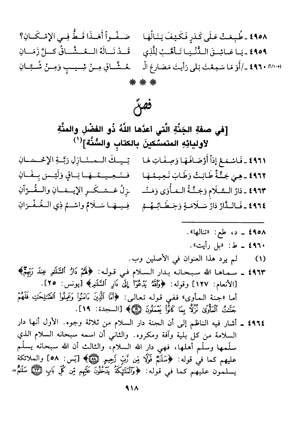 - أشار فيه الناظم إلى أن الجنة دار السلام من ثلاثة وجوه. الاول أنها دار