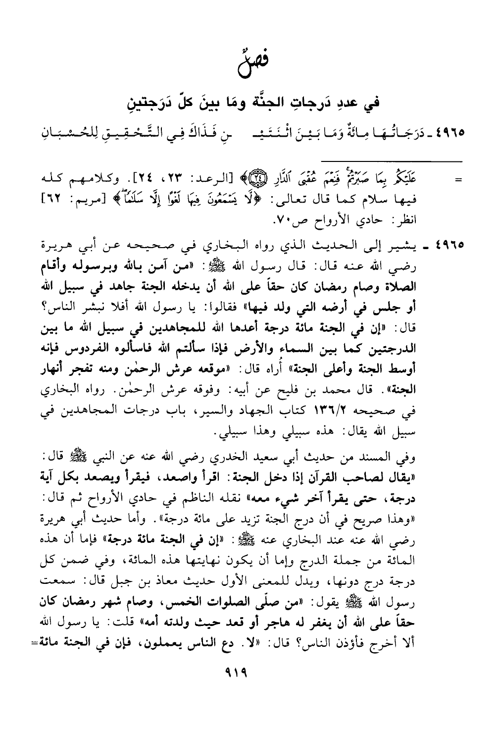 "وهذا صريح في ان درج الجنة تزيد على مائة درجة ". واما حديث ابى هريرة