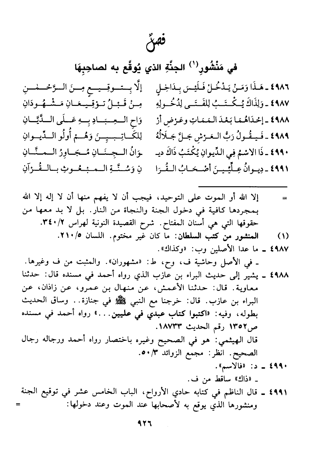 قال الناظم في كتابه حادي الأرواح، الباب الخامس عشر في توقيع الجنة