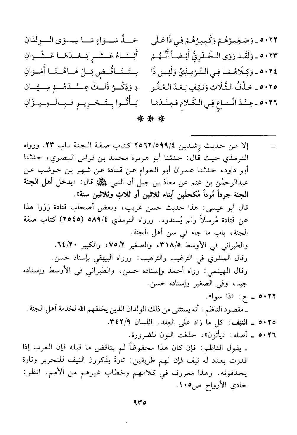 - مقصود الناظم: انه يستثنى من ذلك الولدان الذين يخلقهم الله لخدمة اهل الجنة.