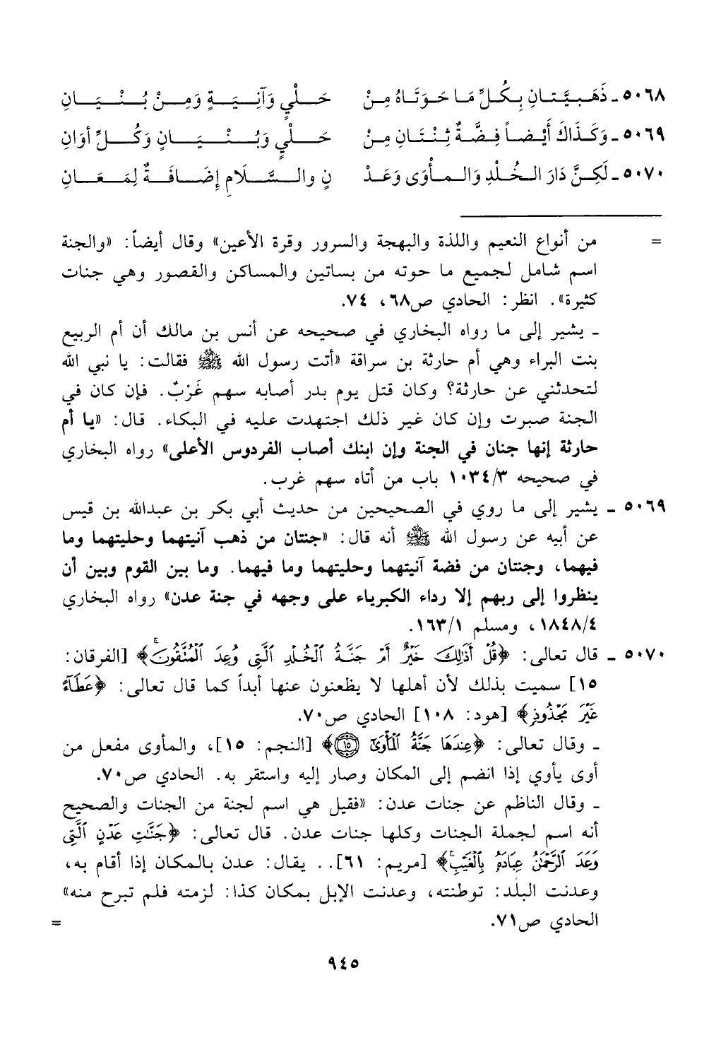 - وقال الناظم عن جنات عدن: "فقيل هي اسم لجنة من الجنات والصحيح