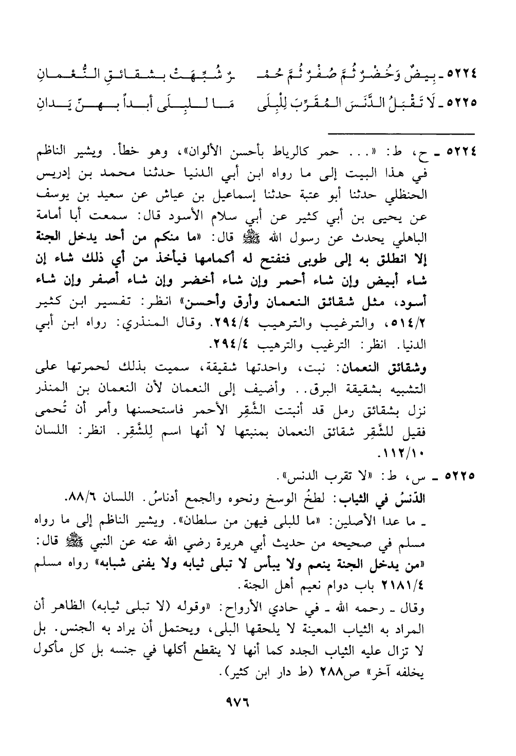 وقال - رحمه الله - قي حادي الأرواح: "وقوله الا تبلى ثيابه) الطاهر ا ن