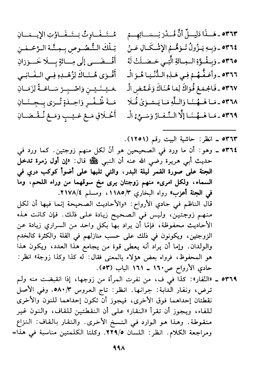 قال الناظم في حادي الأرواح: "والأحاديث الصحيحة إنما فيها ن لكل