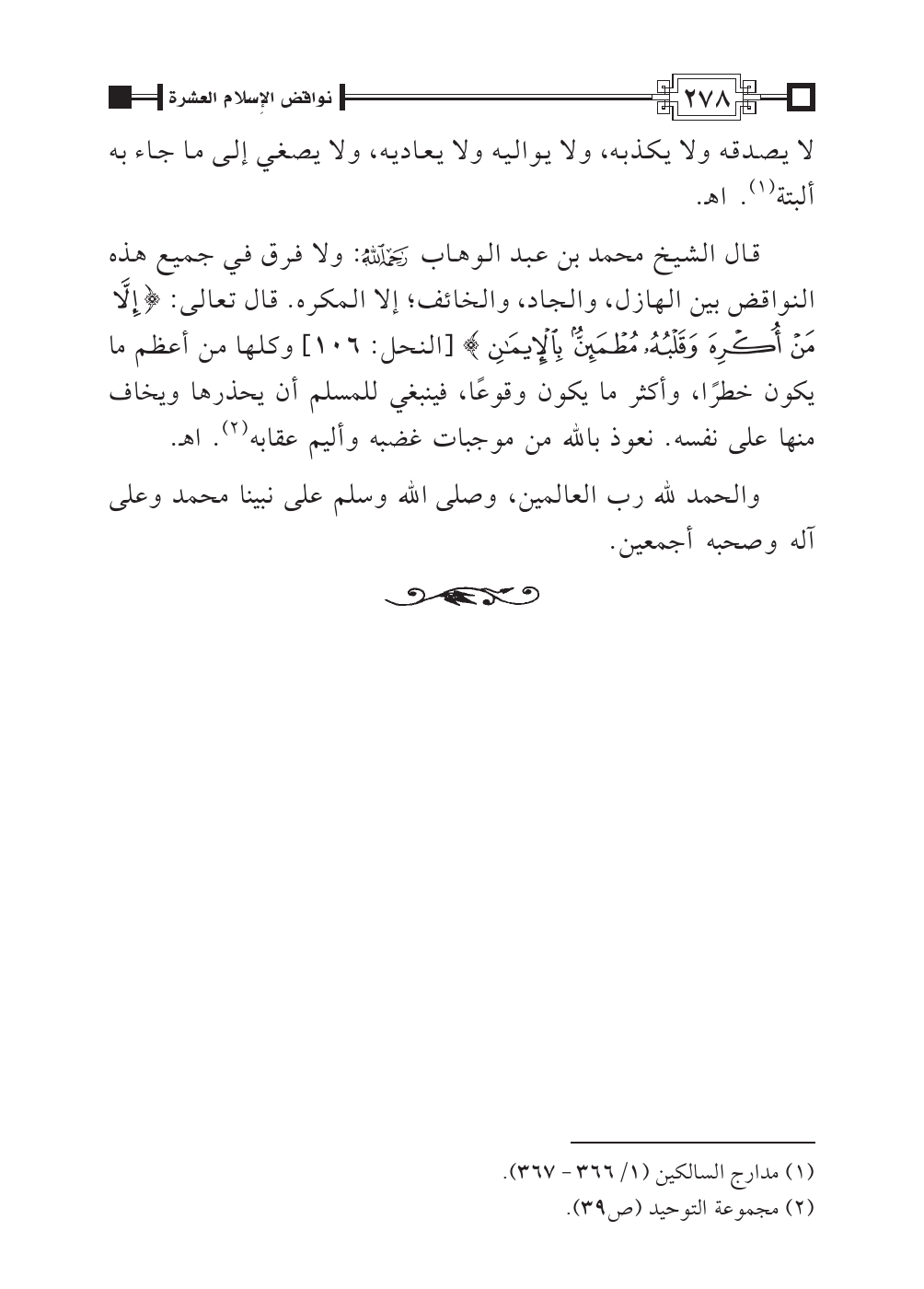 قال الشيخ محمد بن عبد الوهاب رحمه الله: ولا فرق في جميع هذه النواقض بين الهازل، والجاد، والخائف؛ إلا المكره. قال تعالى: {إِلَاّ مَنْ أُكْرِهَ وَقَلْبُهُ مُطْمَئِنٌّ بِالإِيمَانِ} [النحل: ١٠٦] وكلها من أعظم ما يكون خطرًا، وأكثر ما يكون وقوعًا، فينبغي للمسلم أن يحذرها ويخاف منها على نفسه. نعوذ بالله من موجبات غضبه وأليم عقابه (¬٢). اهـ.