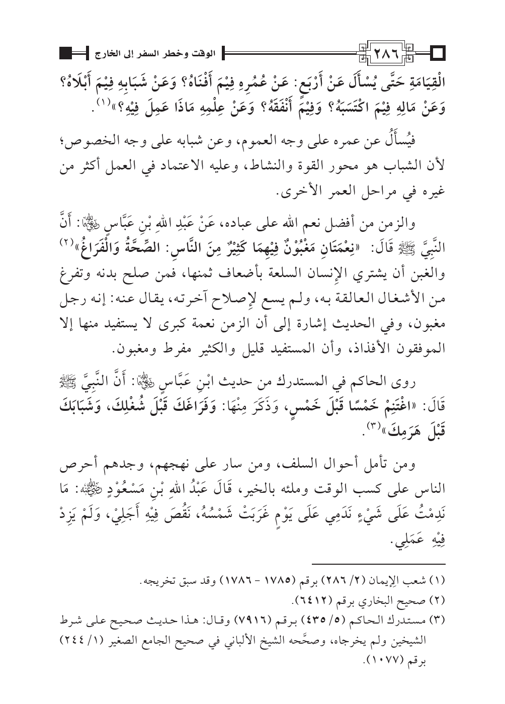 روى الحاكم في المستدرك من حديث ابْنِ عَبَّاسٍ رضي الله عنهما: أَنَّ النَّبِيَّ - صلى الله عليه وسلم - قَالَ: «اغْتَنِمْ خَمْسًا قَبْلَ خَمْسٍ، وَذَكَرَ مِنْهَا: وَفَرَاغَكَ قَبْلَ شُغْلِكَ، وَشَبَابَكَ قَبْلَ هَرَمِكَ» (¬٣).
