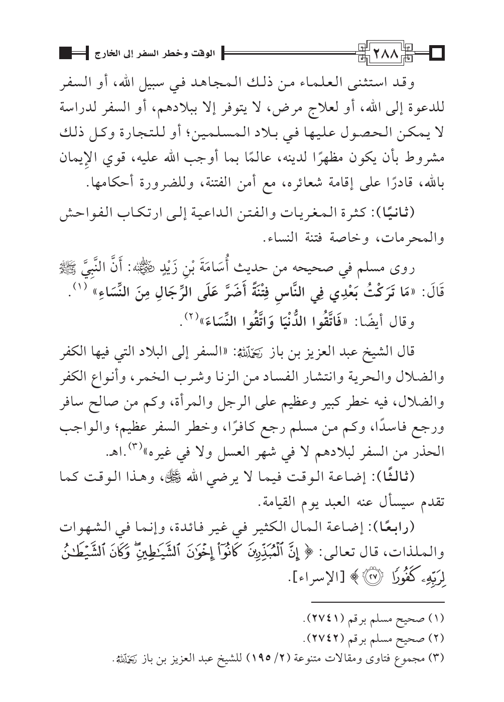 قال الشيخ عبد العزيز بن باز رحمه الله: «السفر إلى البلاد التي فيها الكفر والضلال والحرية وانتشار الفساد من الزنا وشرب الخمر، وأنواع الكفر والضلال، فيه خطر كبير وعظيم على الرجل والمرأة، وكم من صالح سافر ورجع فاسدًا، وكم من مسلم رجع كافرًا، وخطر السفر عظيم؛ والواجب الحذر من السفر لبلادهم لا في شهر العسل ولا في غيره» (¬٣).اهـ.