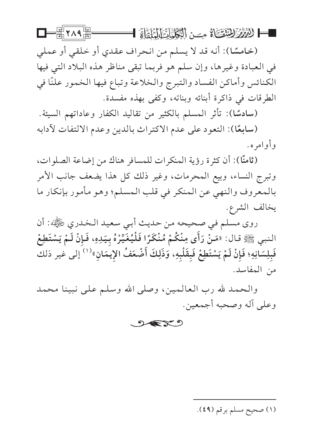 روى مسلم في صحيحه من حديث أبي سعيد الخدري - رضي الله عنه -: أن النبي - صلى الله عليه وسلم - قال: «مَنْ رَأَى مِنْكُمْ مُنْكَرًا فَلْيُغَيِّرْهُ بِيَدِهِ، فَإِنْ لَمْ يَسْتَطِعْ فَبِلِسَانِهِ؛ فَإِنْ لَمْ يَسْتَطِعْ فَبِقَلْبِهِ، وَذَلِكَ أَضْعَفُ الإِيمَانِ» (¬١) إلى غير ذلك من المفاسد.